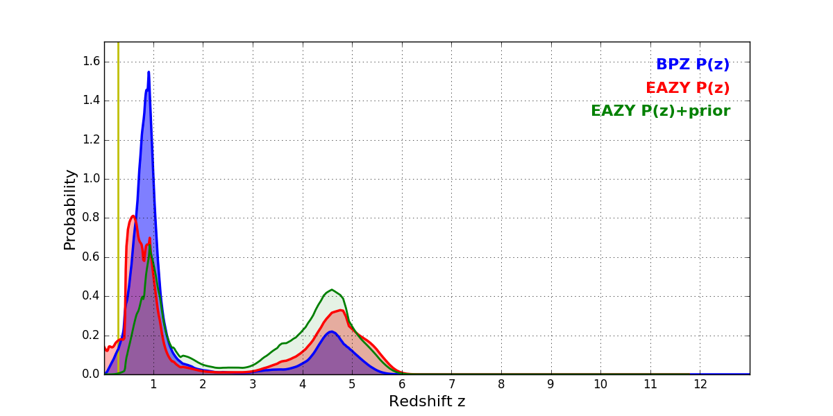 In P(z) plots: Yellow lines mark the cluster redshift z = 0.284,