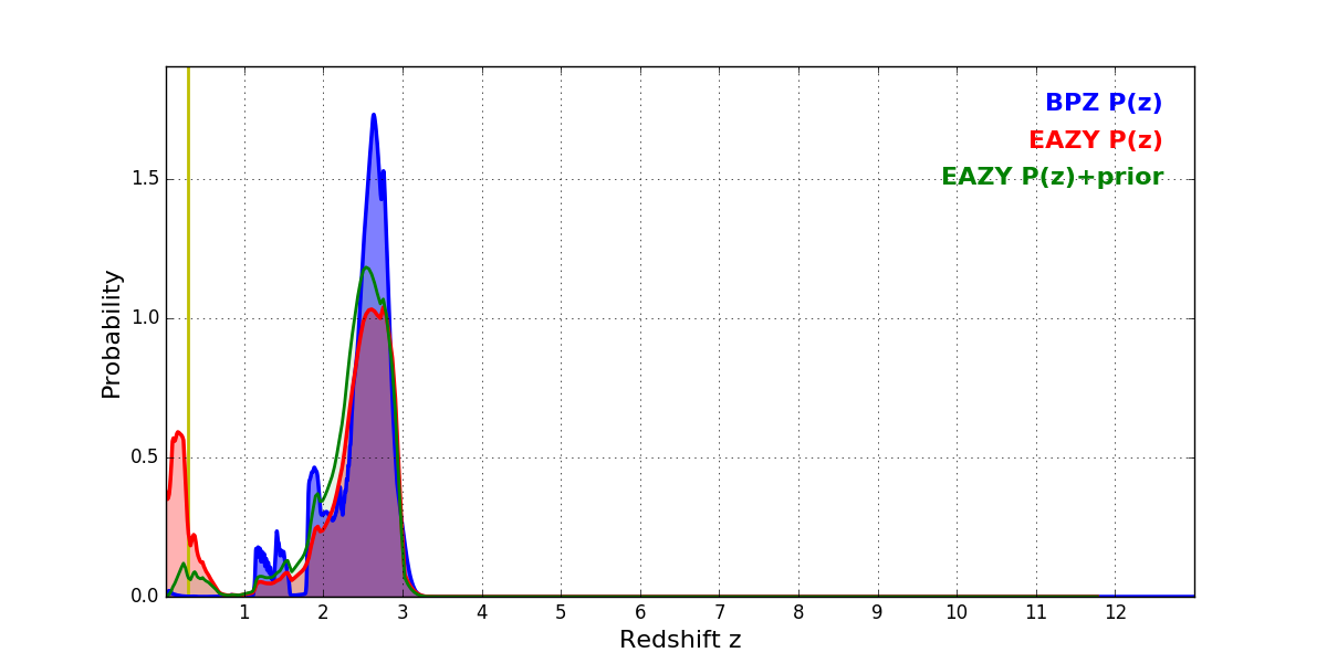In P(z) plots: Yellow lines mark the cluster redshift z = 0.284,