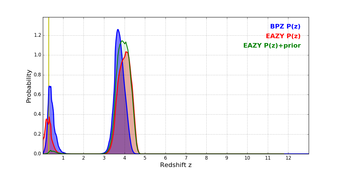 In P(z) plots: Yellow lines mark the cluster redshift z = 0.284,
