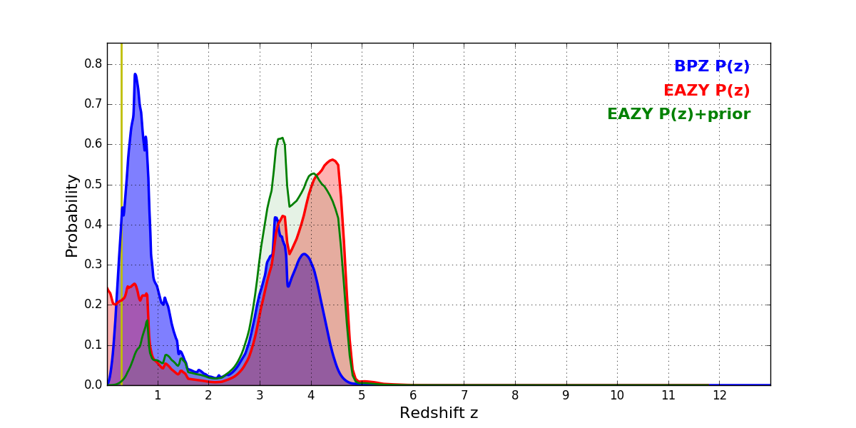 In P(z) plots: Yellow lines mark the cluster redshift z = 0.284,