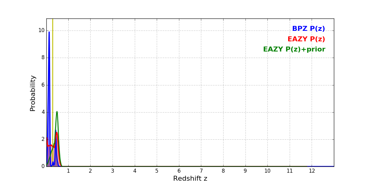 In P(z) plots: Yellow lines mark the cluster redshift z = 0.284,