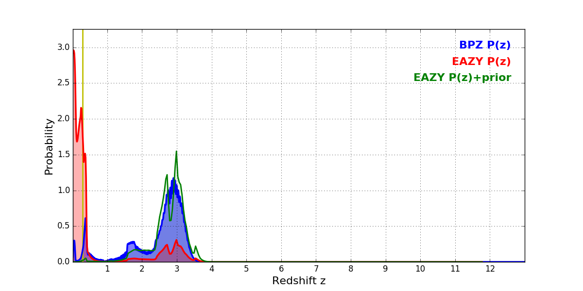In P(z) plots: Yellow lines mark the cluster redshift z = 0.284,
