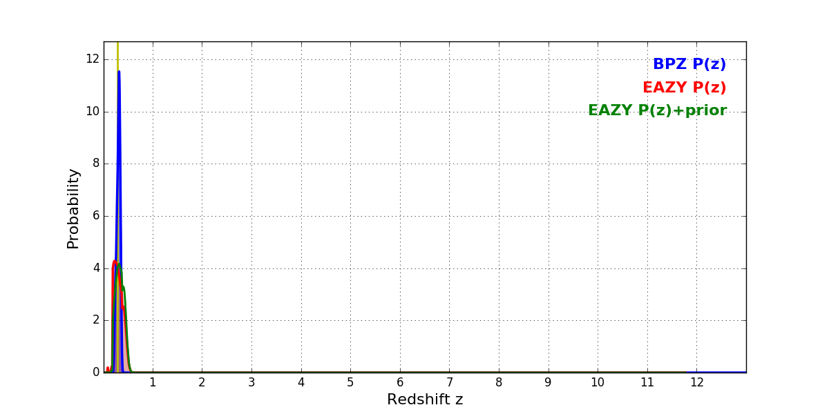 In P(z) plots: Yellow lines mark the cluster redshift z = 0.284,