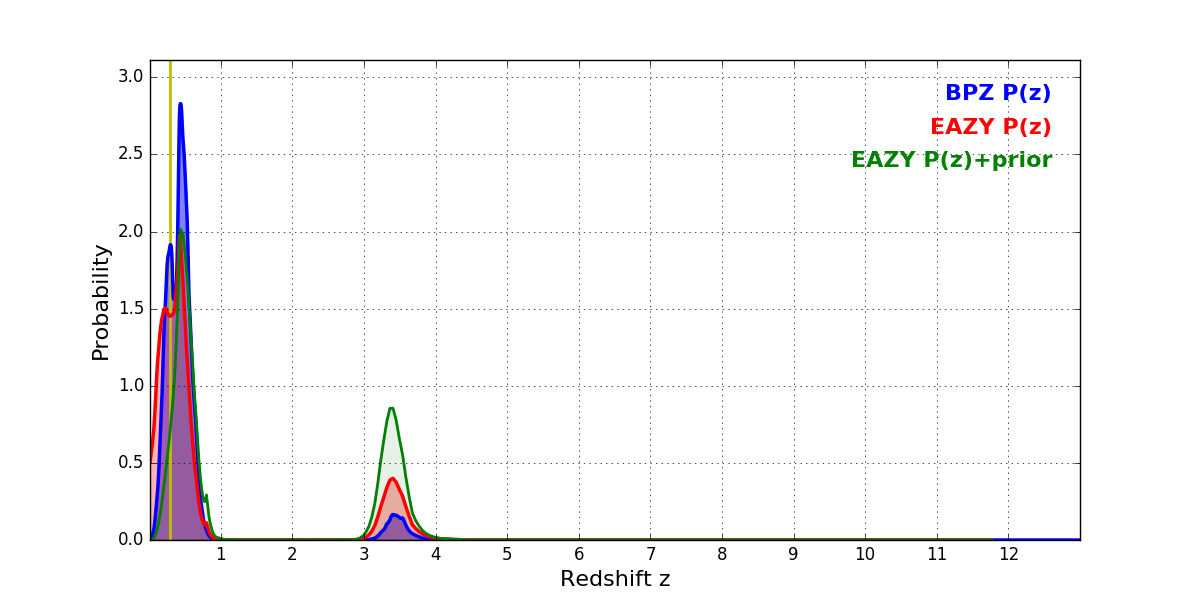 In P(z) plots: Yellow lines mark the cluster redshift z = 0.284,