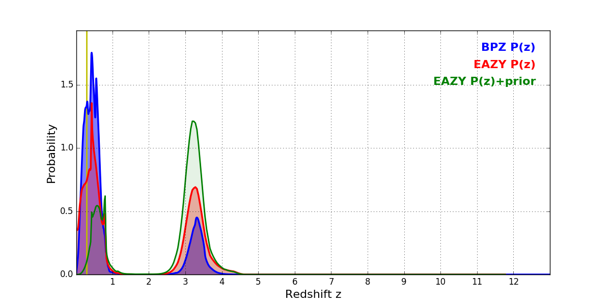 In P(z) plots: Yellow lines mark the cluster redshift z = 0.284,
