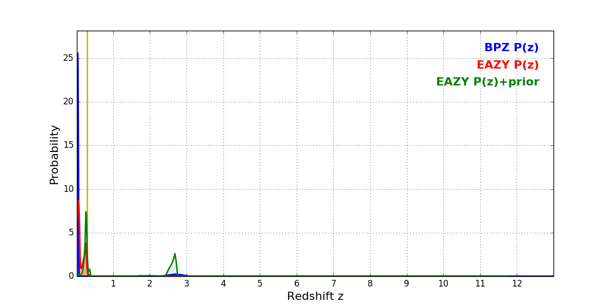 In P(z) plots: Yellow lines mark the cluster redshift z = 0.284,
