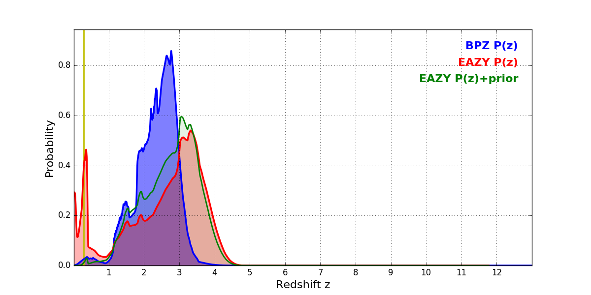 In P(z) plots: Yellow lines mark the cluster redshift z = 0.284,