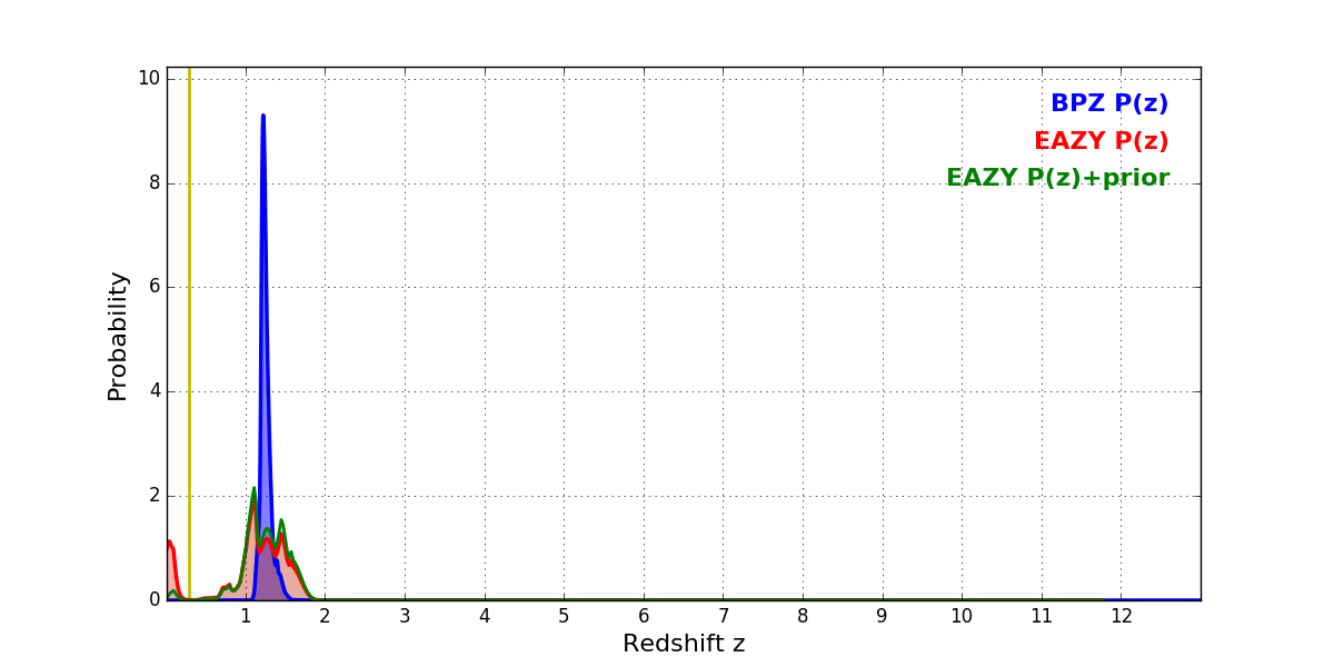 In P(z) plots: Yellow lines mark the cluster redshift z = 0.284,