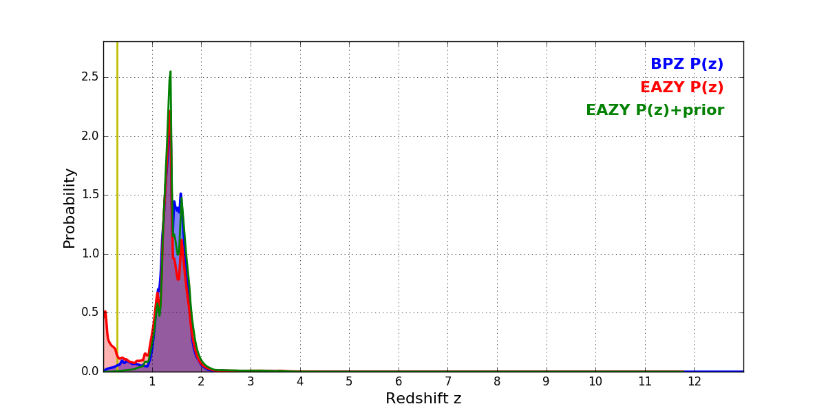 In P(z) plots: Yellow lines mark the cluster redshift z = 0.284,