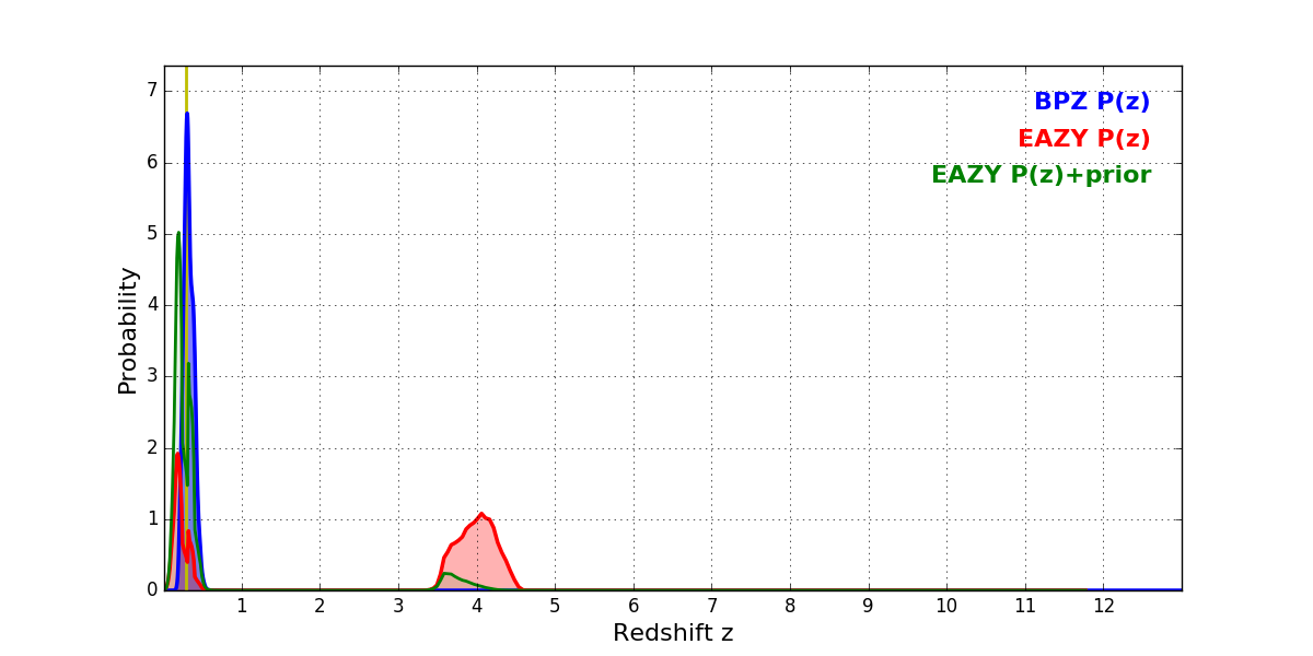 In P(z) plots: Yellow lines mark the cluster redshift z = 0.284,