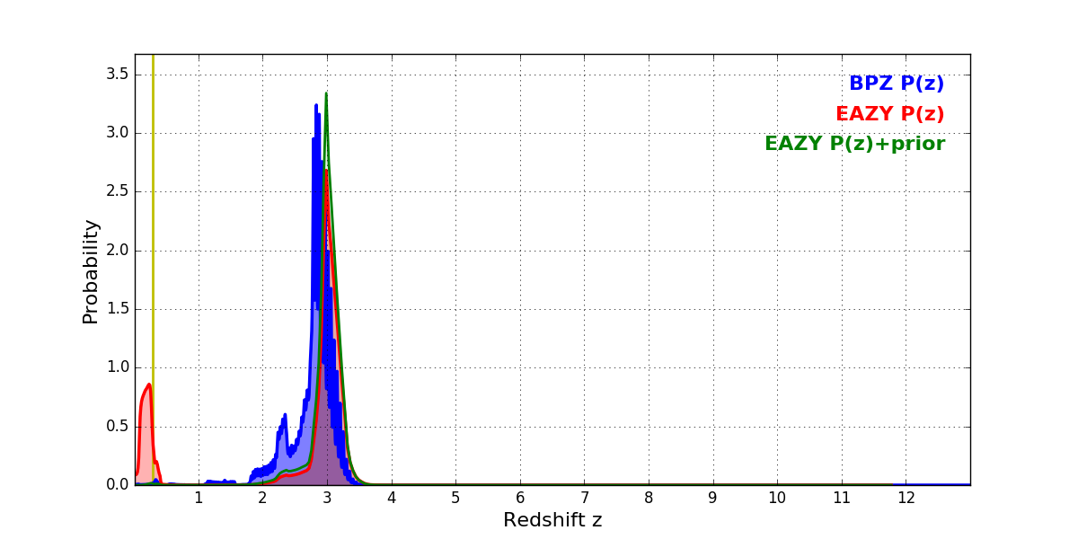 In P(z) plots: Yellow lines mark the cluster redshift z = 0.284,