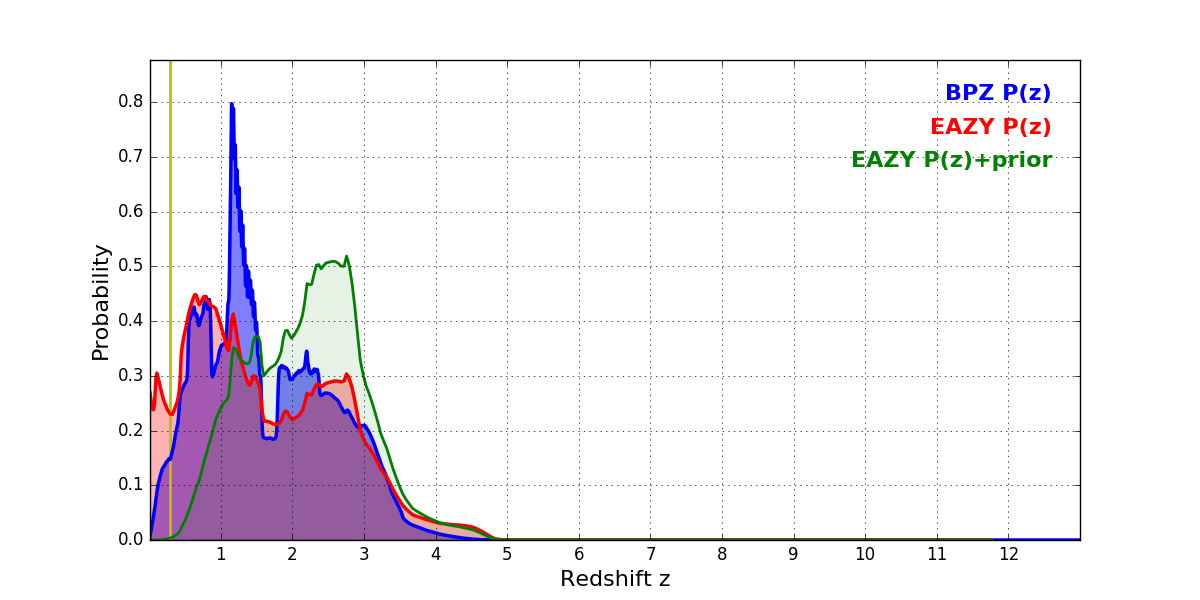 In P(z) plots: Yellow lines mark the cluster redshift z = 0.284,