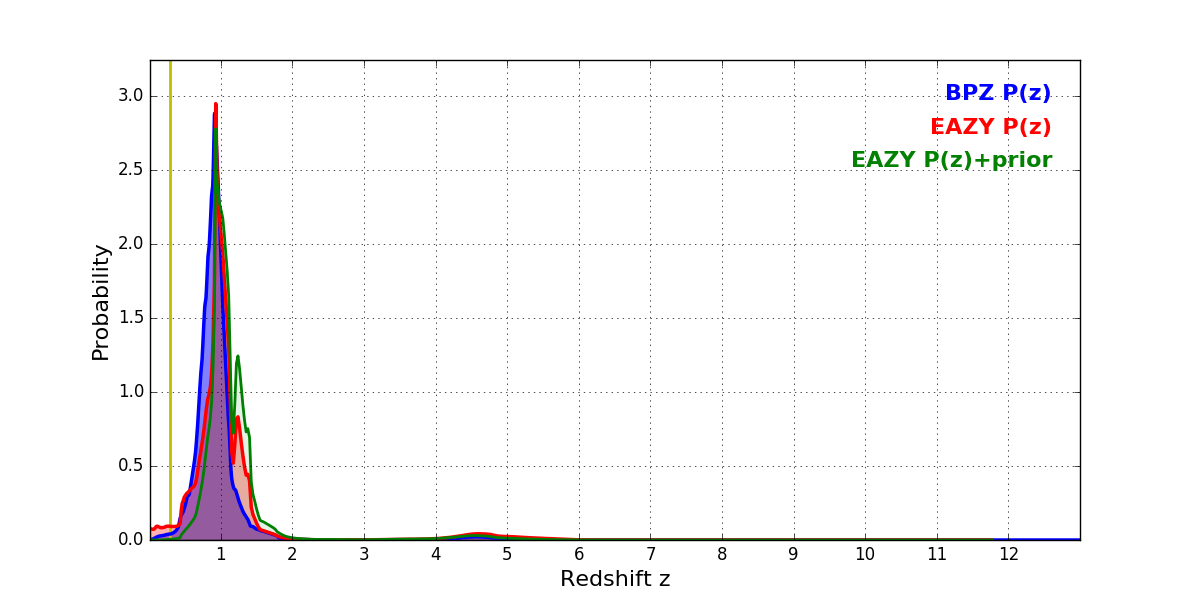 In P(z) plots: Yellow lines mark the cluster redshift z = 0.284,