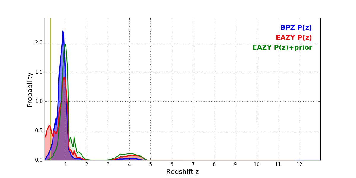 In P(z) plots: Yellow lines mark the cluster redshift z = 0.284,