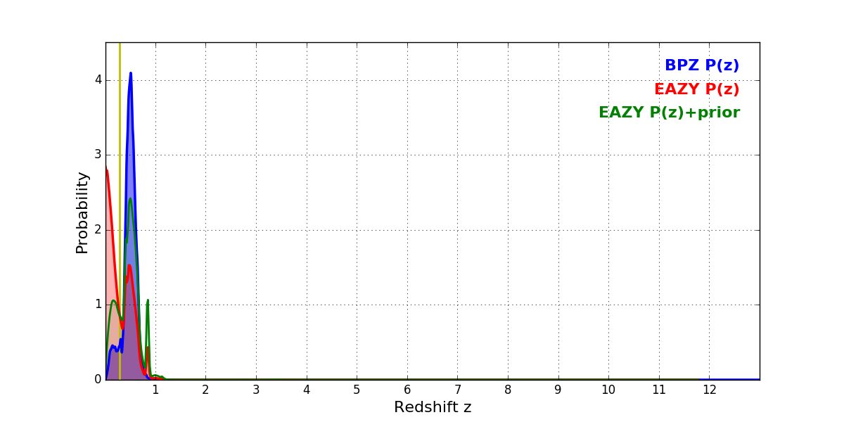 In P(z) plots: Yellow lines mark the cluster redshift z = 0.284,