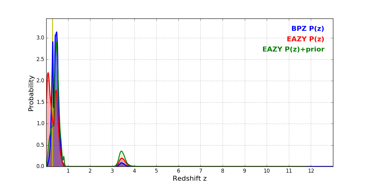 In P(z) plots: Yellow lines mark the cluster redshift z = 0.284,