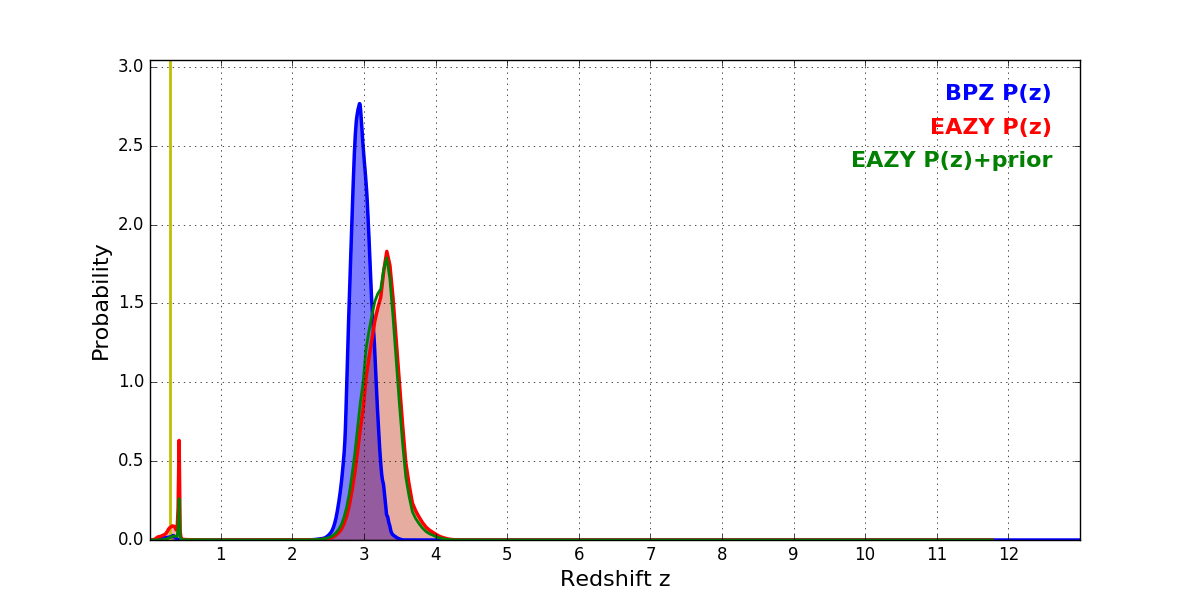 In P(z) plots: Yellow lines mark the cluster redshift z = 0.284,
