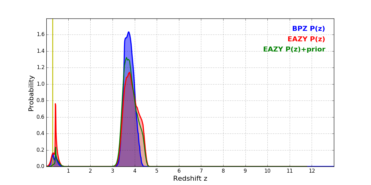 In P(z) plots: Yellow lines mark the cluster redshift z = 0.284,
