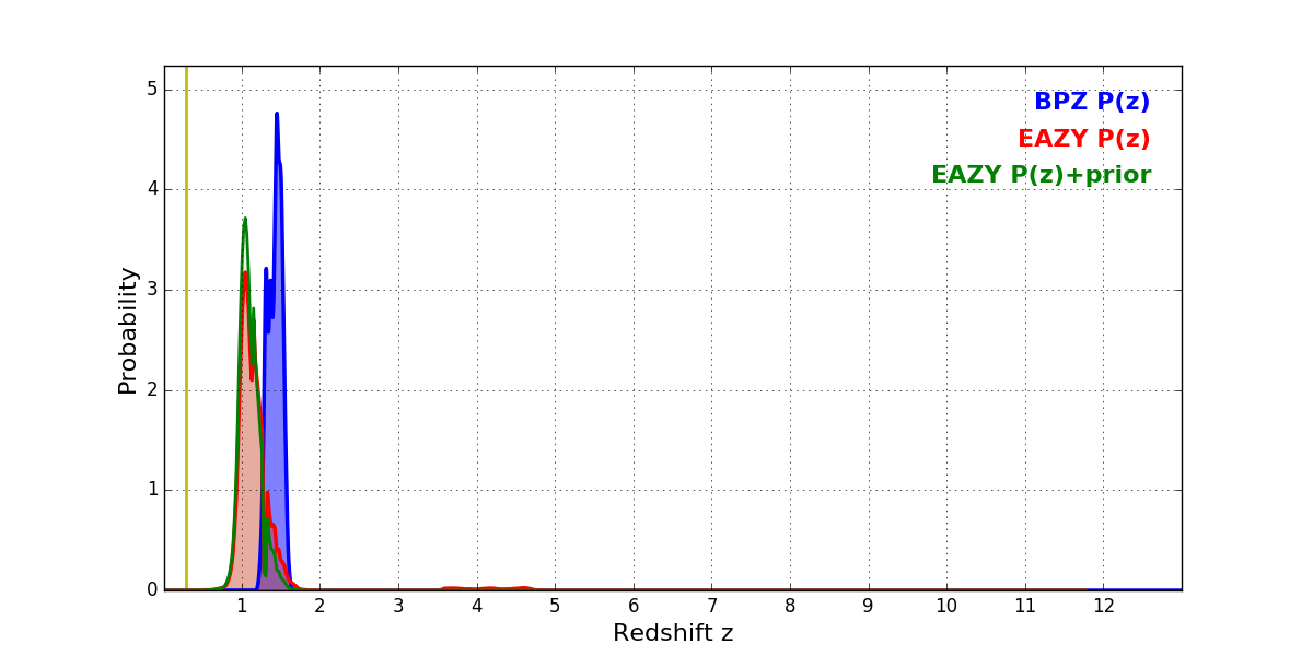 In P(z) plots: Yellow lines mark the cluster redshift z = 0.284,