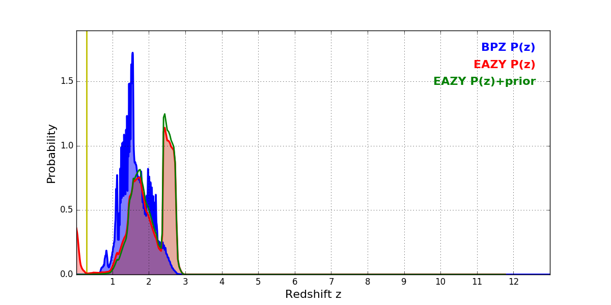 In P(z) plots: Yellow lines mark the cluster redshift z = 0.284,
