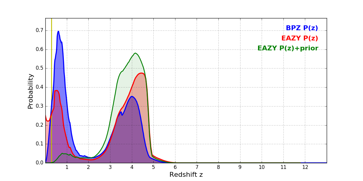 In P(z) plots: Yellow lines mark the cluster redshift z = 0.284,