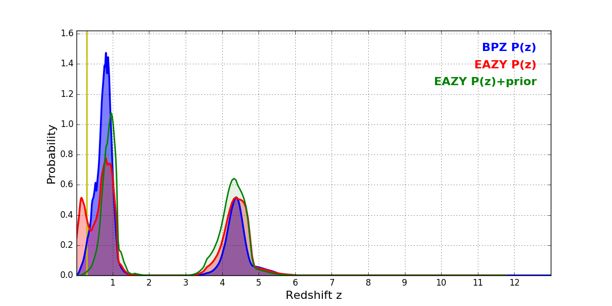 In P(z) plots: Yellow lines mark the cluster redshift z = 0.284,
