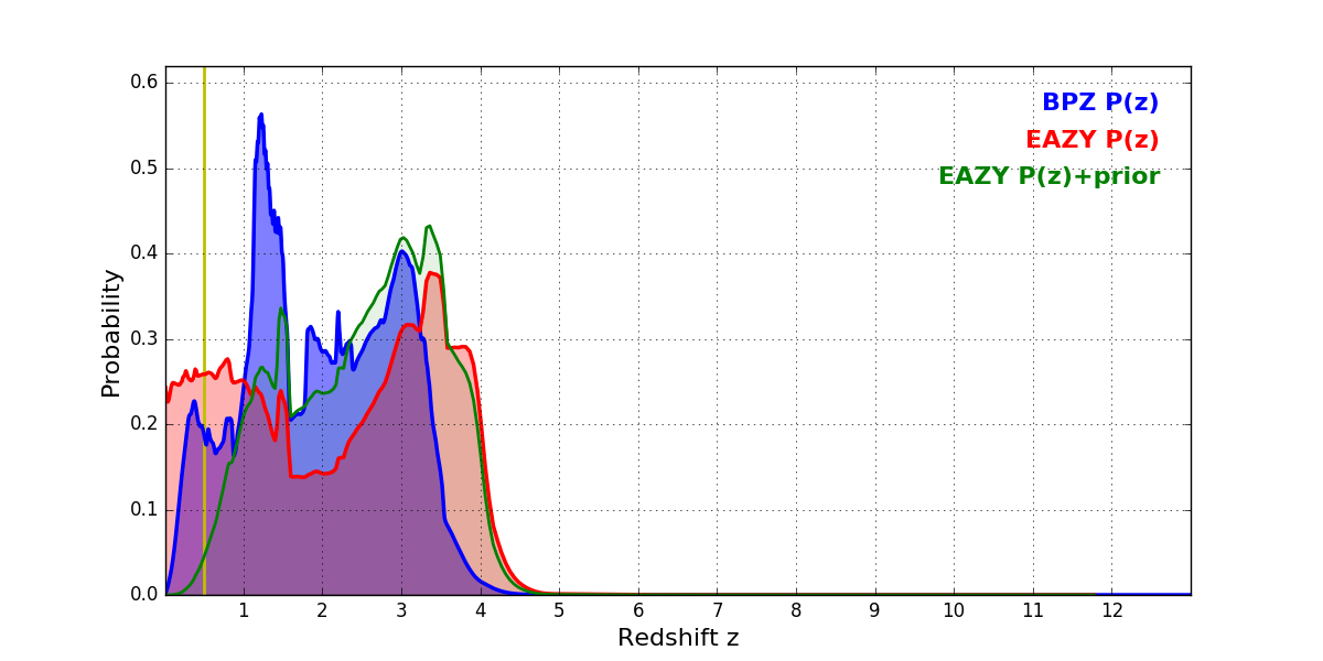 In P(z) plots: Yellow lines mark the cluster redshift z = 0.505,