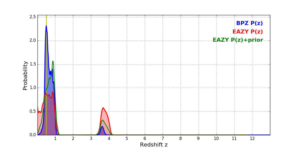In P(z) plots: Yellow lines mark the cluster redshift z = 0.505,