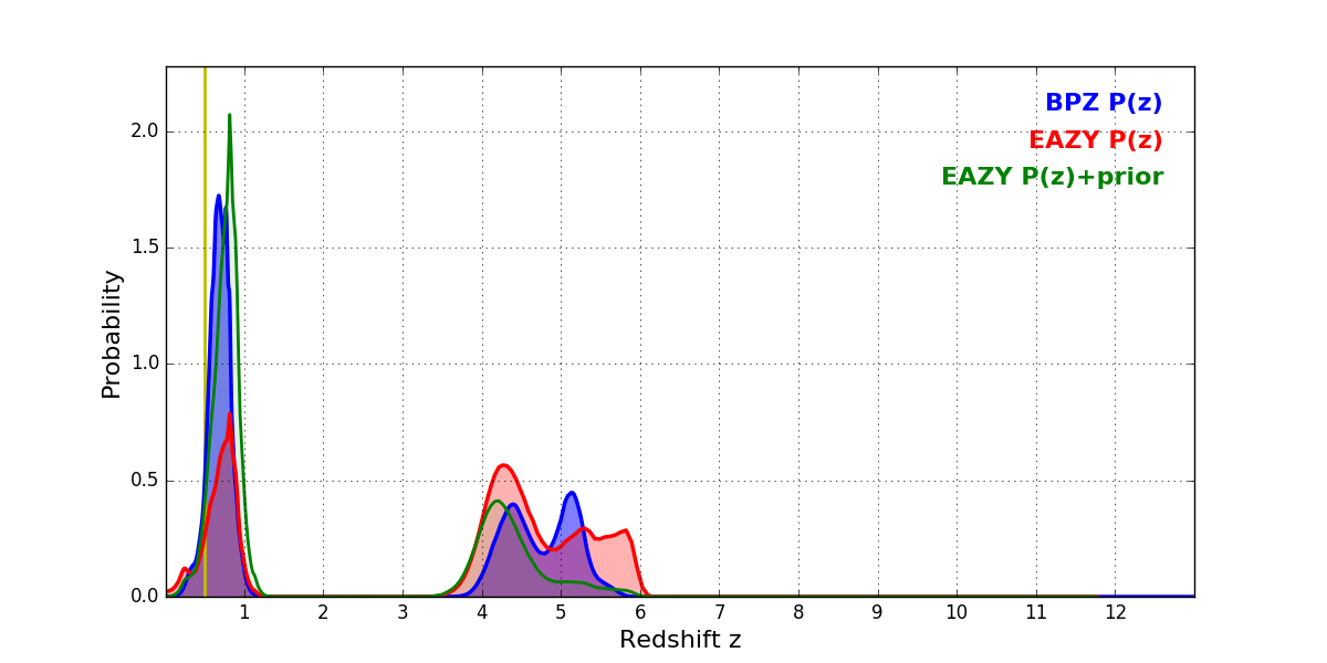 In P(z) plots: Yellow lines mark the cluster redshift z = 0.505,