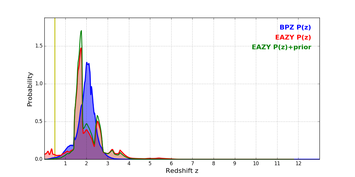 In P(z) plots: Yellow lines mark the cluster redshift z = 0.505,
