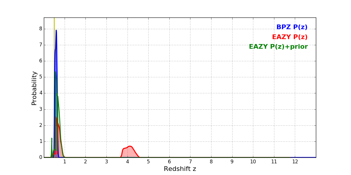 In P(z) plots: Yellow lines mark the cluster redshift z = 0.505,