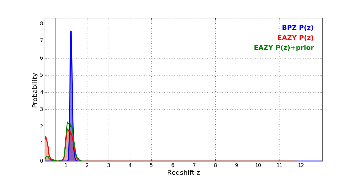 In P(z) plots: Yellow lines mark the cluster redshift z = 0.505,