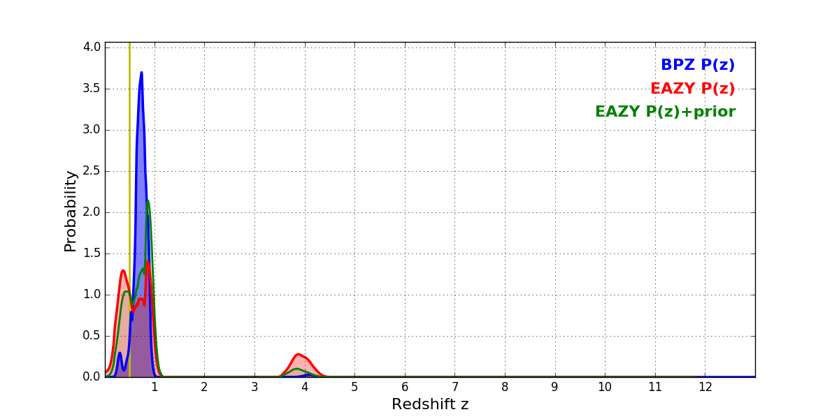 In P(z) plots: Yellow lines mark the cluster redshift z = 0.505,