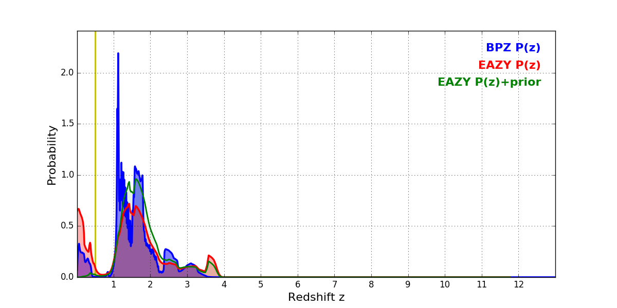 In P(z) plots: Yellow lines mark the cluster redshift z = 0.505,