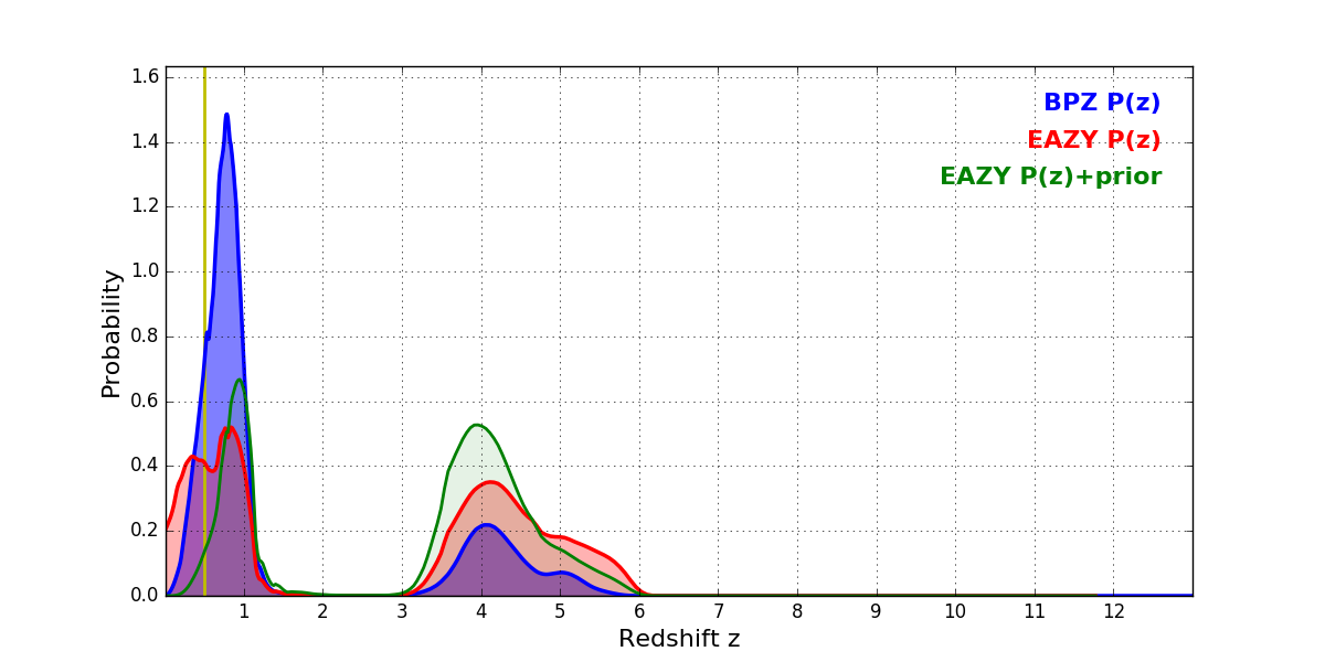 In P(z) plots: Yellow lines mark the cluster redshift z = 0.505,
