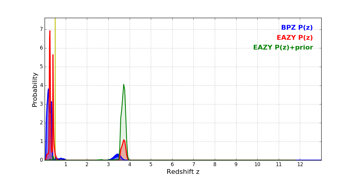 In P(z) plots: Yellow lines mark the cluster redshift z = 0.505,