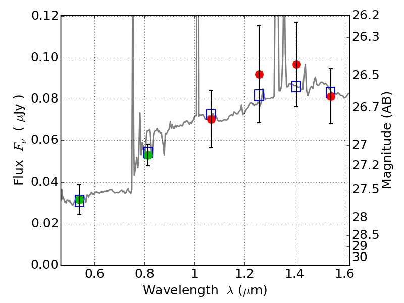 Object #455 x,y = (3593, 2387) RA, Dec = (09:11:08.016, 17:46:49.44) = (137.78340, 17.78040) BPZ = 1.017 [0.074--3.633] type = 9.20 (SB2_B10 - SB3_B10) chisq2 = 0.17 ODDS = 0.18 z_cluster = 0.505