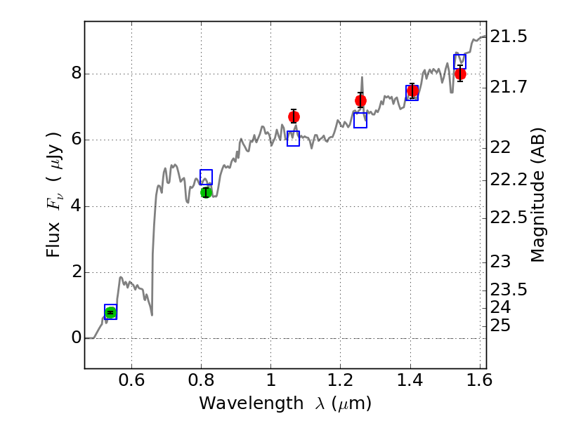 Object #559 x,y = (2441, 2231) RA, Dec = (09:11:12.864, 17:46:40.08) = (137.80360, 17.77780) BPZ = 4.428 [4.377--4.475] type = 7.90 (SB1_B10 - Scd_B10) chisq2 = 1.10 ODDS = 1.00 z_cluster = 0.505