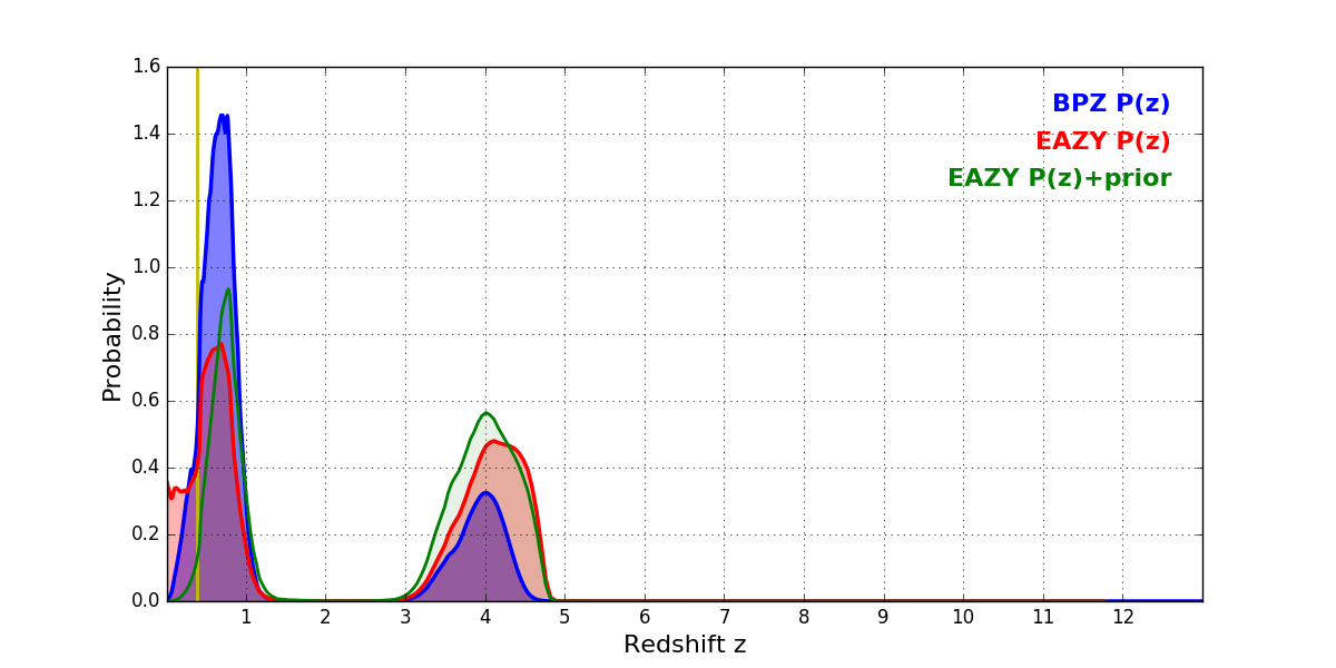 In P(z) plots: Yellow lines mark the cluster redshift z = 0.383,