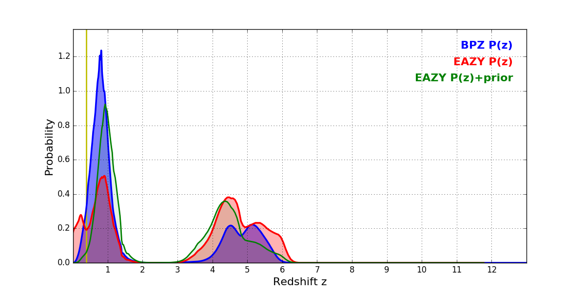 In P(z) plots: Yellow lines mark the cluster redshift z = 0.383,
