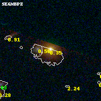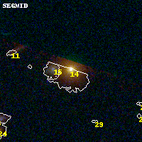 Object #14 x,y = (2695, 3535) RA, Dec = (09:49:51.960, 17:08:23.28) = (147.46650, 17.13980) BPZ = 0.351 [0.319--0.441] type = 5.20 (ES0_B10 - Sbc_B10) chisq2 = 0.09 ODDS = 0.79 z_cluster = 0.383