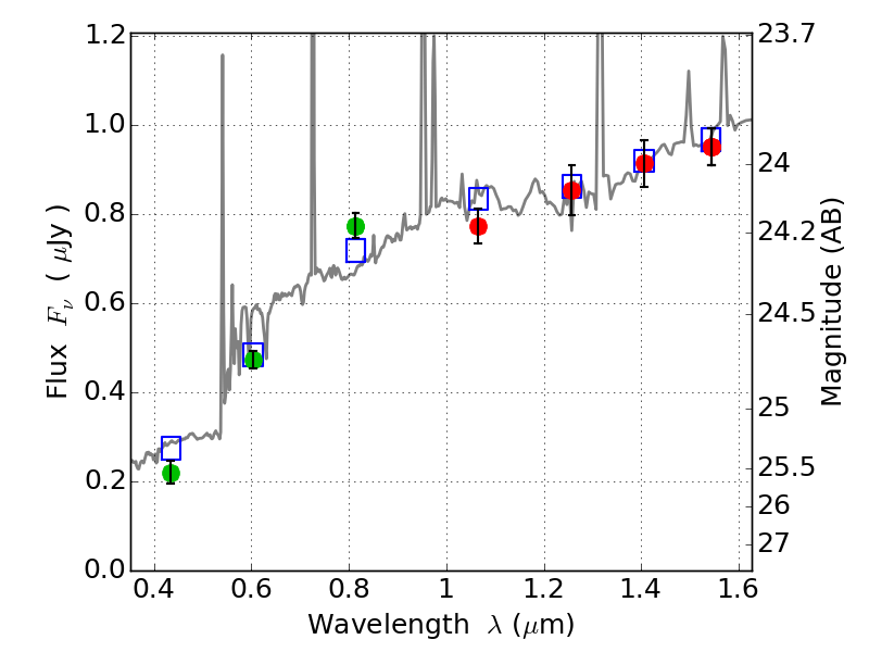 Object #173   x,y = (2364, 3007)   RA, Dec = (09:49:53.352, 17:07:51.60) = (147.47230, 17.13100)   BPZ = 0.448 [0.408--0.625]   type = 8.80 (SB2_B10 - SB1_B10)   chisq2 = 0.39   ODDS = 0.60   z_cluster = 0.383