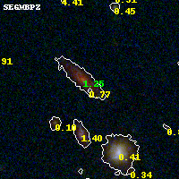 Object #271 x,y = (3194, 2770) RA, Dec = (09:49:49.872, 17:07:37.56) = (147.45780, 17.12710) BPZ = 0.766 [0.116--0.843] type = 9.80 (SB3_B10 - SB2_B10) chisq2 = 0.70 ODDS = 0.51 z_cluster = 0.383