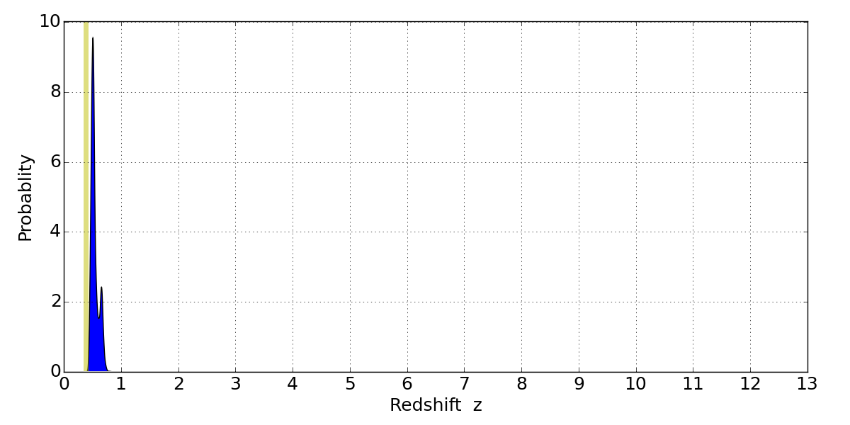 In P(z) plots: Yellow lines mark the cluster redshift z = 0.383,
