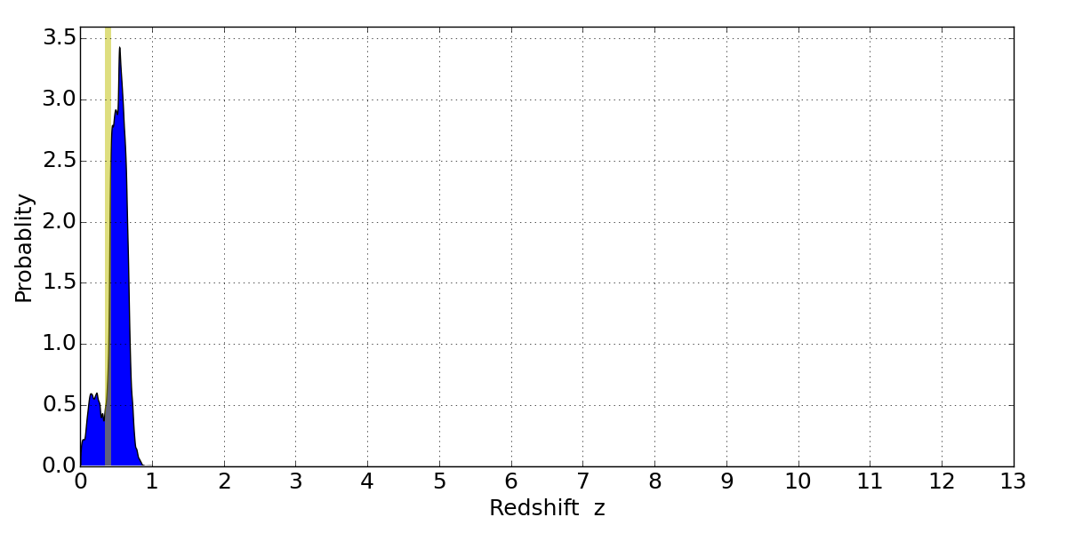 In P(z) plots: Yellow lines mark the cluster redshift z = 0.383,