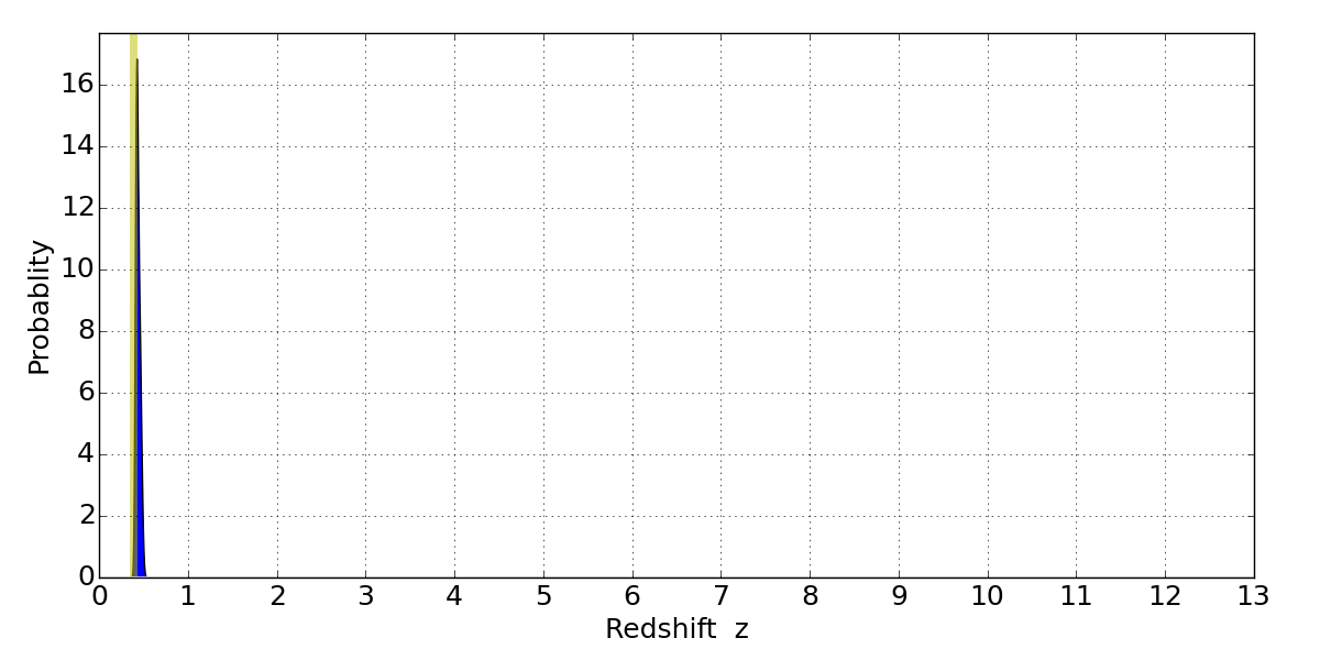 In P(z) plots: Yellow lines mark the cluster redshift z = 0.383,