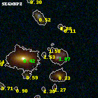 Object #592 x,y = (3620, 2205) RA, Dec = (09:49:48.096, 17:07:03.72) = (147.45040, 17.11770) BPZ = 1.498 [1.088--2.941] type = 10.10 (SB3_B10 - SB11_A_0_l) chisq2 = 0.15 ODDS = 0.18 z_cluster = 0.383