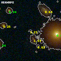 Object #688 x,y = (3325, 2052) RA, Dec = (09:49:49.320, 17:06:54.36) = (147.45550, 17.11510) BPZ = 1.210 [0.232--1.971] type = 8.60 (SB2_B10 - SB1_B10) chisq2 = 0.88 ODDS = 0.21 z_cluster = 0.383