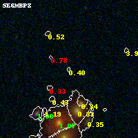 Object #800 x,y = (3499, 1827) RA, Dec = (09:49:48.600, 17:06:41.04) = (147.45250, 17.11140) BPZ = 0.397 [0.085--3.435] type = 10.70 (SB11_A_0_l - SB3_B10) chisq2 = 0.49 ODDS = 0.33 z_cluster = 0.383