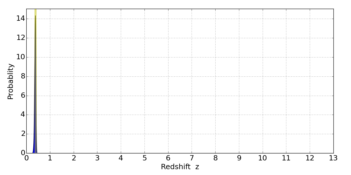 In P(z) plots: Yellow lines mark the cluster redshift z = 0.383,